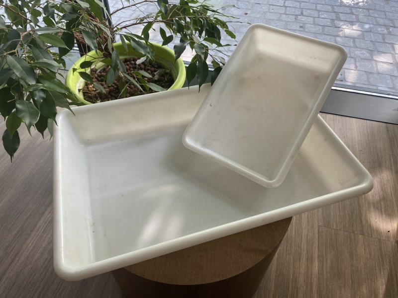3 grands bacs blancs, 4 petits et 10 petites bassines rondes blanches.