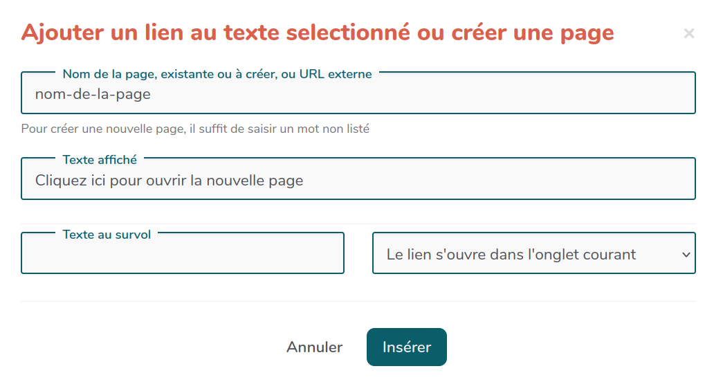 Quand je clique sur « insérer », ça génère cette ligne de code : [Cliquez ici pour ouvrir la nouvelle page](nom-de-la-page)