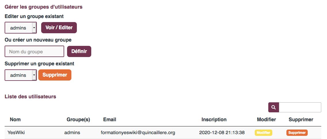 Un seul groupe existe par défaut sur le wiki @admins et contient par défaut un seul utilisateur à savoir celui qui a créé le wiki.