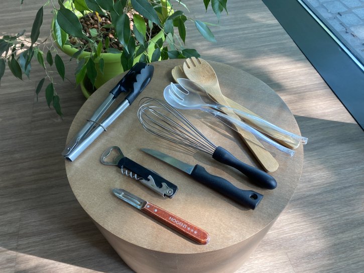 5 paires de couverts à salade en plastique, 10 paires de couverts à salade en bambou, 2 pinces de service, 1 Rouleau à pâtisserie, 5 louches, 2 fouets, 2 économes, 2 ouvre-boîtes, 7 tire-bouchons décapsuleurs, 3 passoires-louches, 1 spatule en bois, 1 maryse et 1 pinceau de cuisine.