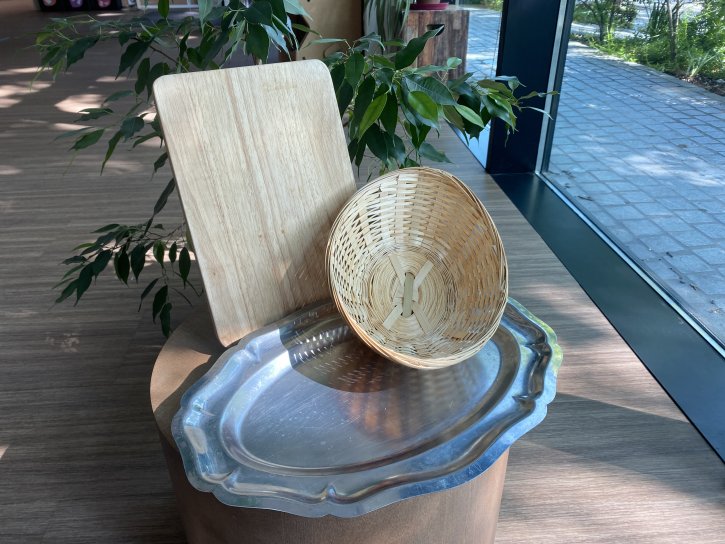 1 passoire en inox, 5 petits plateaux en plastique, 10 grands plateaux en plastique, 9 grands plateaux en inox, 1 grand plateau en inox, 15 corbeilles à pain, 22 carafes et 9 planches à découper dont 1 en plastique et 8 en bois.